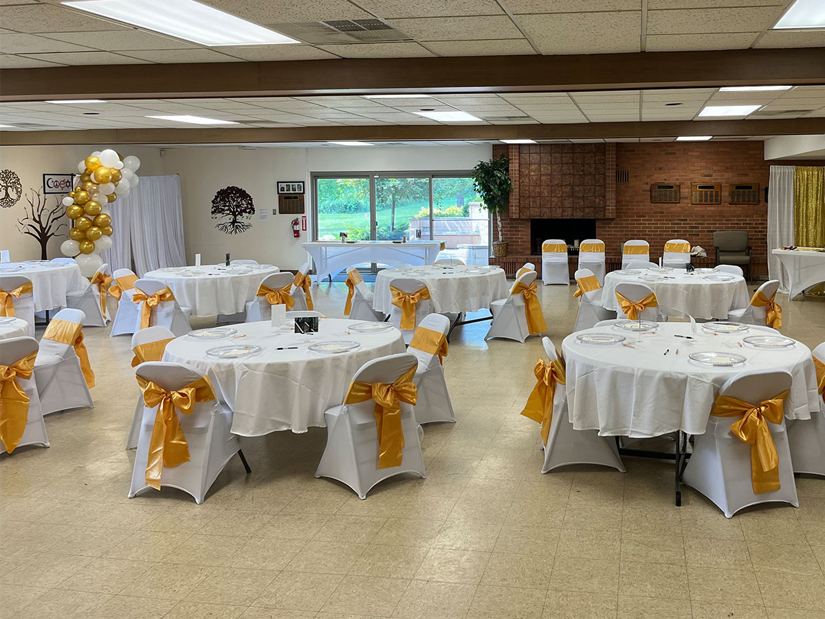 The hall can accommodate up to 175 guests. We have 11 round tables, 25 eight-foot tables, and enough chairs for very large receptions. There is a small stage at one end of the room with a piano you can use. Sliding glass doors offer access to our well-manicured lawn and a small playground.